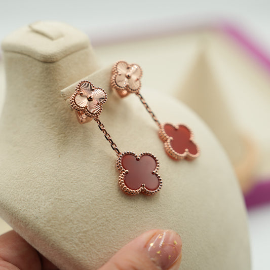 Carnelian & Guillioche 2 mootif clover earrings 925 silver 18k rose gold plated