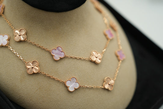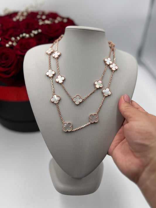 20 motif Mother of pearl clover necklace 925 silver 18k rose gold plated 84 cm long