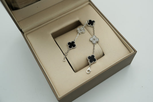 Onyx & CZ clover bracelet 925 silver 18k white gold plated