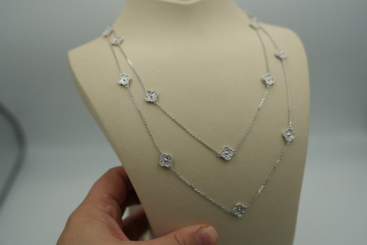 20 motif Mother of pearl & CZ clover necklace 925 silver 18k white gold plated 84 cm long