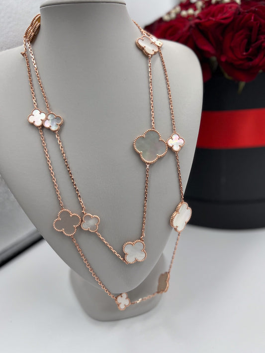 20 motif Mother of pearl & CZ clover necklace 925 silver 18k gold plated 84 cm long